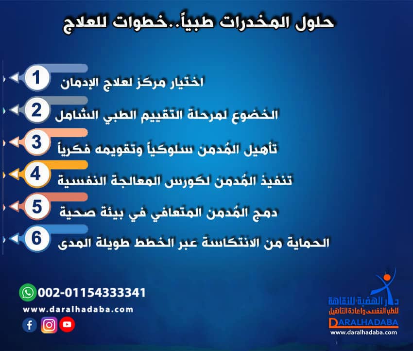 حلول تعاطي المخدرات لعلاج الادمان بشكل آمن وفعّال طبياً فهي تنفيذ 7 خطوات تُمكن المُدمن من التوقف عن التعاطي على المدى البعيد نلخصها فيما يلي: