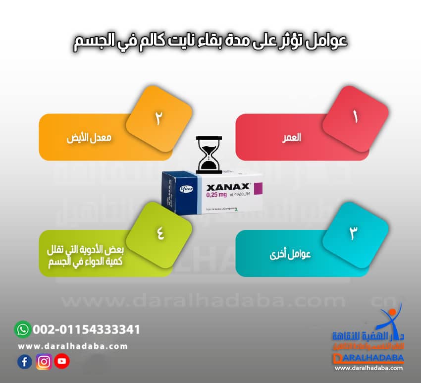 تبلغ مدة بقاء نايت كالم في الدم حوالي ساعة تقريبا حيث يصل إلى ذروة تأثيره خلال تلك الفترة، ثم يعاود الانخفاض مرة أخرى. بينما تبلغ مدة بقاء نايت كالم في البول لمدة 48 ساعة فقط ، لذلك لا يظهر في التحاليل المخصصة لذلك الدواء لأكثر من تلك الفترة، ولكن تبلغ مدة بقائه في الشعر لمدة تصل إلى 90 يوم تقريباً. في حين أن اختبارات اللعاب تكون غير قادرة على اكتشاف نايت كالم في نظام الجسم، حيث لا تكون هناك جرعة من الدواء في اللعاب وتختلف مدة البقاء على عدة عوامل كما يلي:-